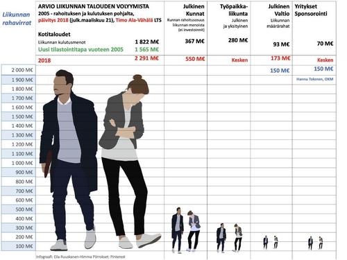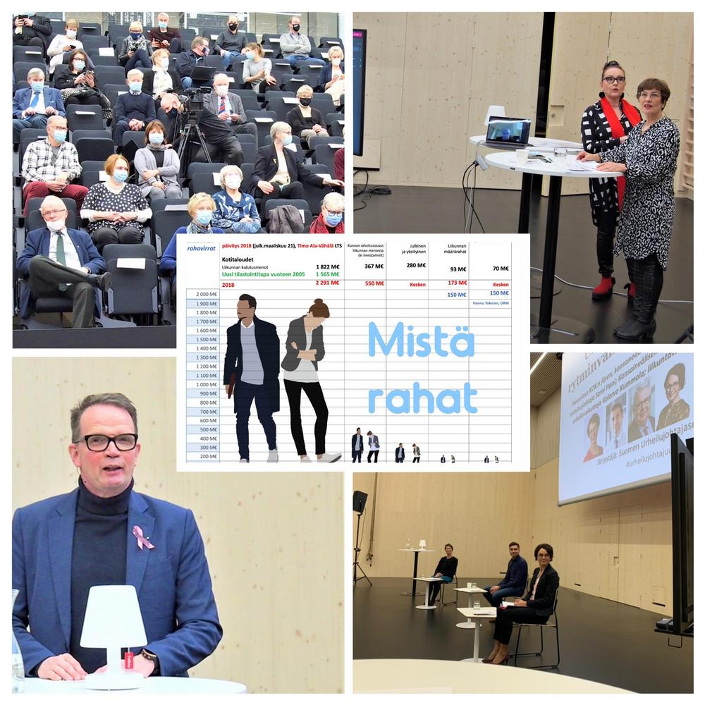 Kuvien joukossa on myös seminaarissa esitetty dia liikunnan rahavirroista. Tutkija Timo Ala-Vähälältä (Liikuntatieteellinen seura) saatiin paneeliin alustavia tuloksia liikunnan rahavirroista 2018; raportti julkistetaan maaliskuussa 2021.